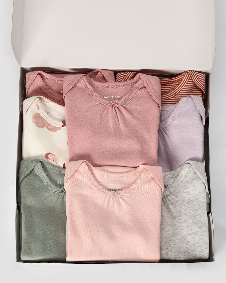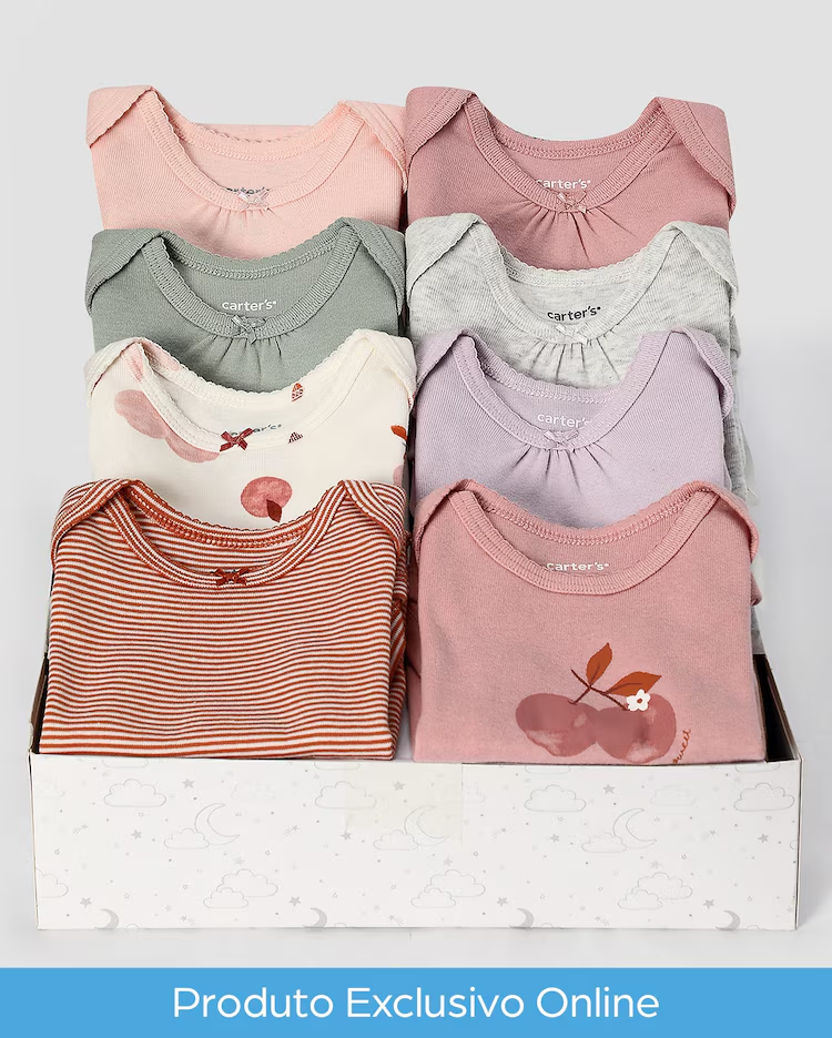 O Kit body bebê 8 peças manga curta lisos e cerejas + caixa presente M multicor | Carter's é a escolha perfeita para o dia a dia de sua baby que está descobrindo o mundinho dela. Com modelagem transpassada nos ombros e botões de pressão nas entrepernas, o kit possui modelos de malha macia, são confortáveis e fáceis de vestir. Aposte nesse conforto e deixe a sua baby livre para se movimentar!