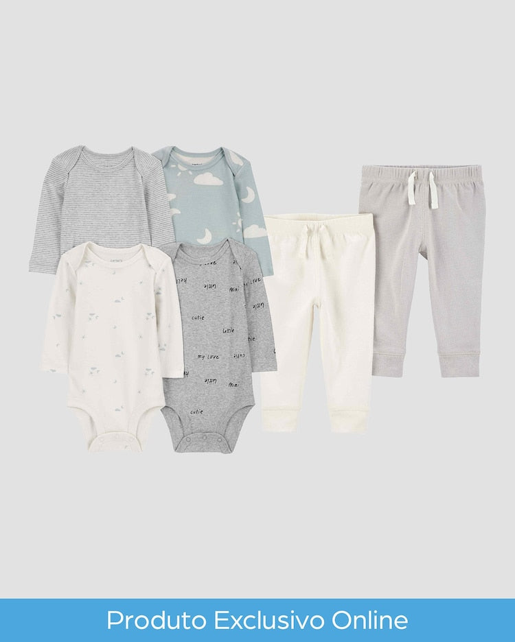 Suas definições de fofura foram atualizadas. O Enxoval bebê conjunto longo 6 peças nuvens listrado multicor | Carter's é perfeito para deixar seu baby ainda mais lindinho e confortável no dia a dia. O kit conta com 2 calças e 4 bodies de mangas longas com estampas diversas. Um charminho para a neném descobrir o mundinho ao redor dela cheia de estilo e aconchego. Aproveite!