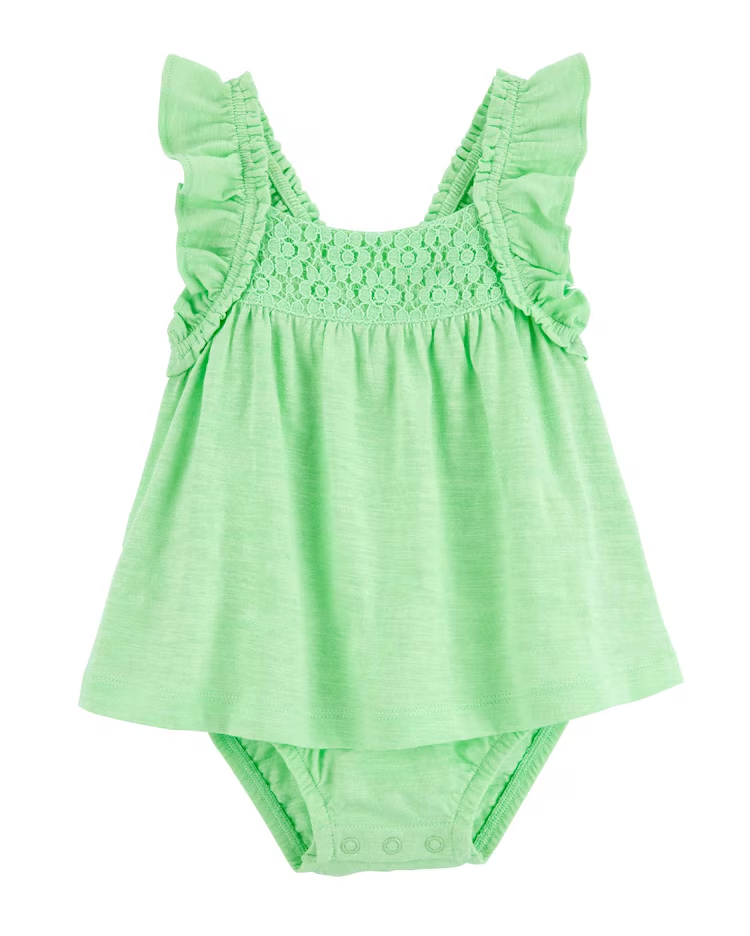 O Banho de sol bebê com babados verde | Carter's é o cuidado que a sua baby precisa nos dias ensolarados. Feito de algodão, a peça é confortável, traz um charme único por meio de sua modelagem e o toque final com acabamento em renda. Possui alças médias, babados e elástico para melhor conforto. O lookinho certo para sair com os papais e aproveitar muito o verão!
